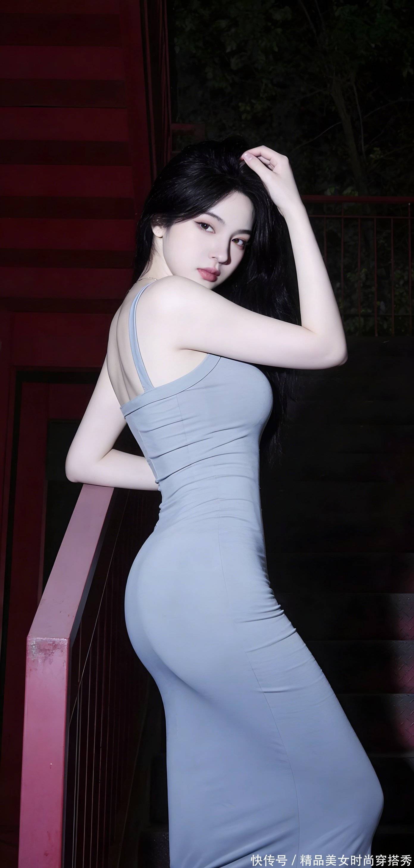 黑长发垂到腰际,浅蓝紧身裙像第二层皮肤,把肩线、腰窝、臀线都裹得服服帖帖 —— 没有多余的装饰,却比任何露肤都更勾人。她半倚在红栏杆上,一只手搭在扶手上,指尖泛着粉,另一只手轻轻蹭过锁骨,眼神懒懒散散扫过来,连风都忍不住放慢了脚步,怕惊扰了这片刻的蛊惑。
