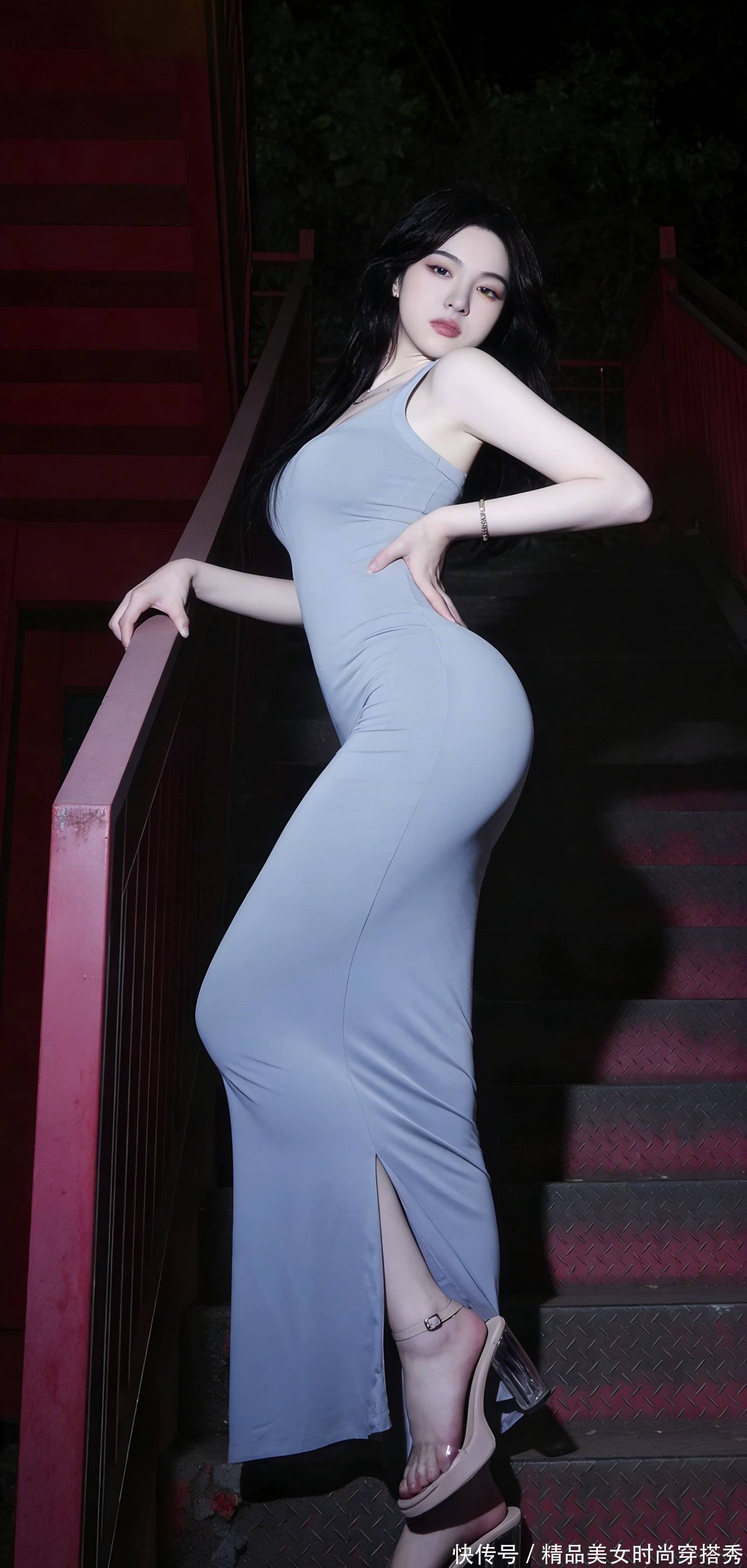 红色的金属楼梯泛着冷光,和她瓷白的皮肤、雾蓝的裙装撞出最艳的反差。裙摆垂到脚踝,透明跟的高跟鞋露着纤细的脚趾,每一寸线条都在说 “克制”,却又在转身时,漏出腰侧一点软肉,看得人喉头发紧。